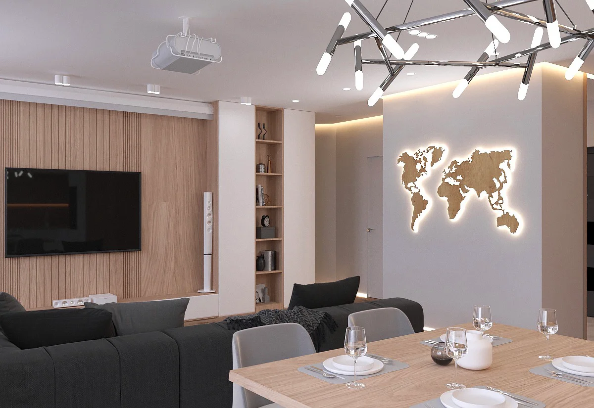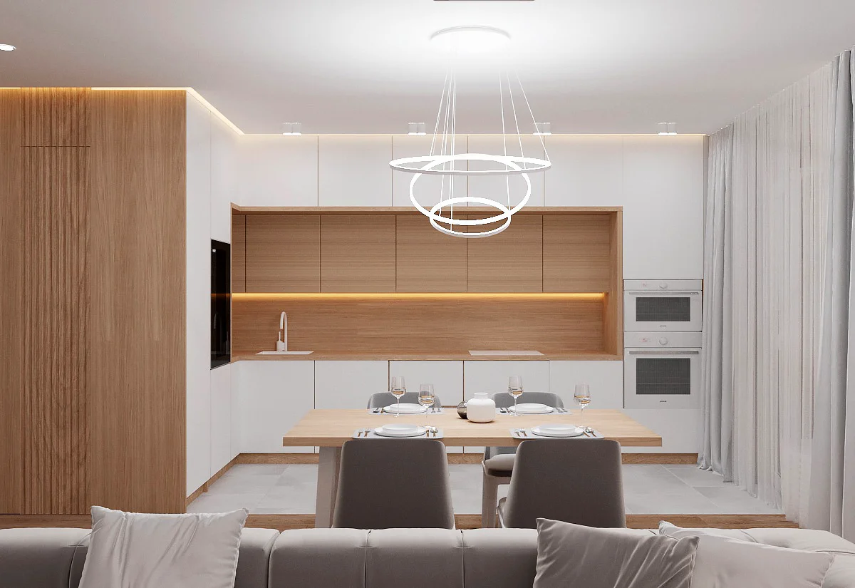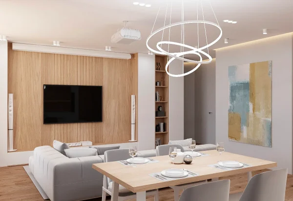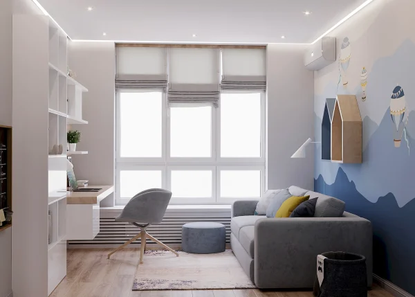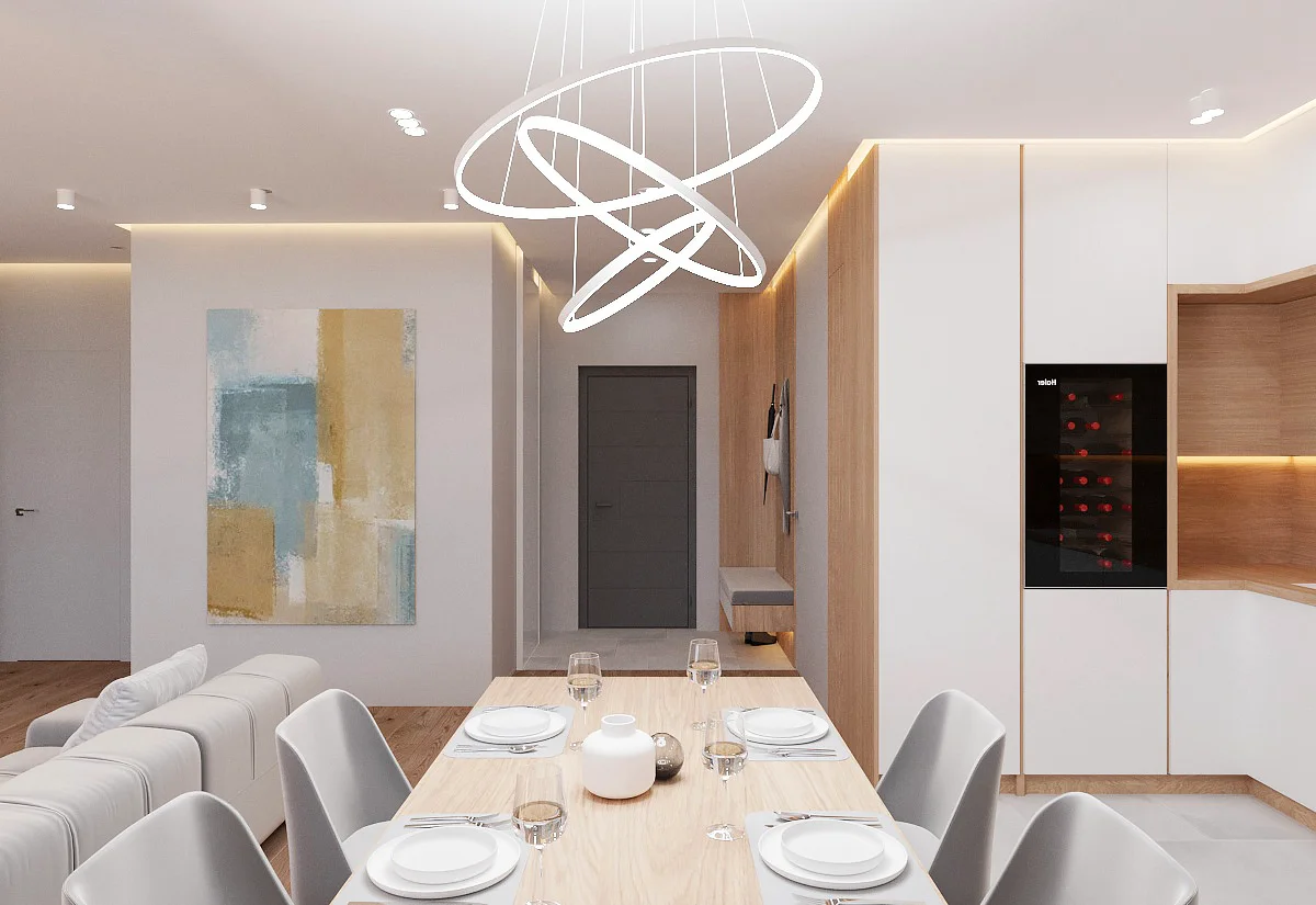Дизайн проекта квартиры площадью 49,9 м² создан в светлых пастельных тонах, придающих простору легкости и уюта. Квартира имеет функциональную планировку: просторная кухня-гостиная для совместного отдыха, уютная спальня, гардеробная комната для удобного хранения вещей, современный санузел и стильная прихожая. Светлые оттенки в интерьере подчеркивают простор, а продуманное зонирование делает квартиру идеальной для комфортной жизни.