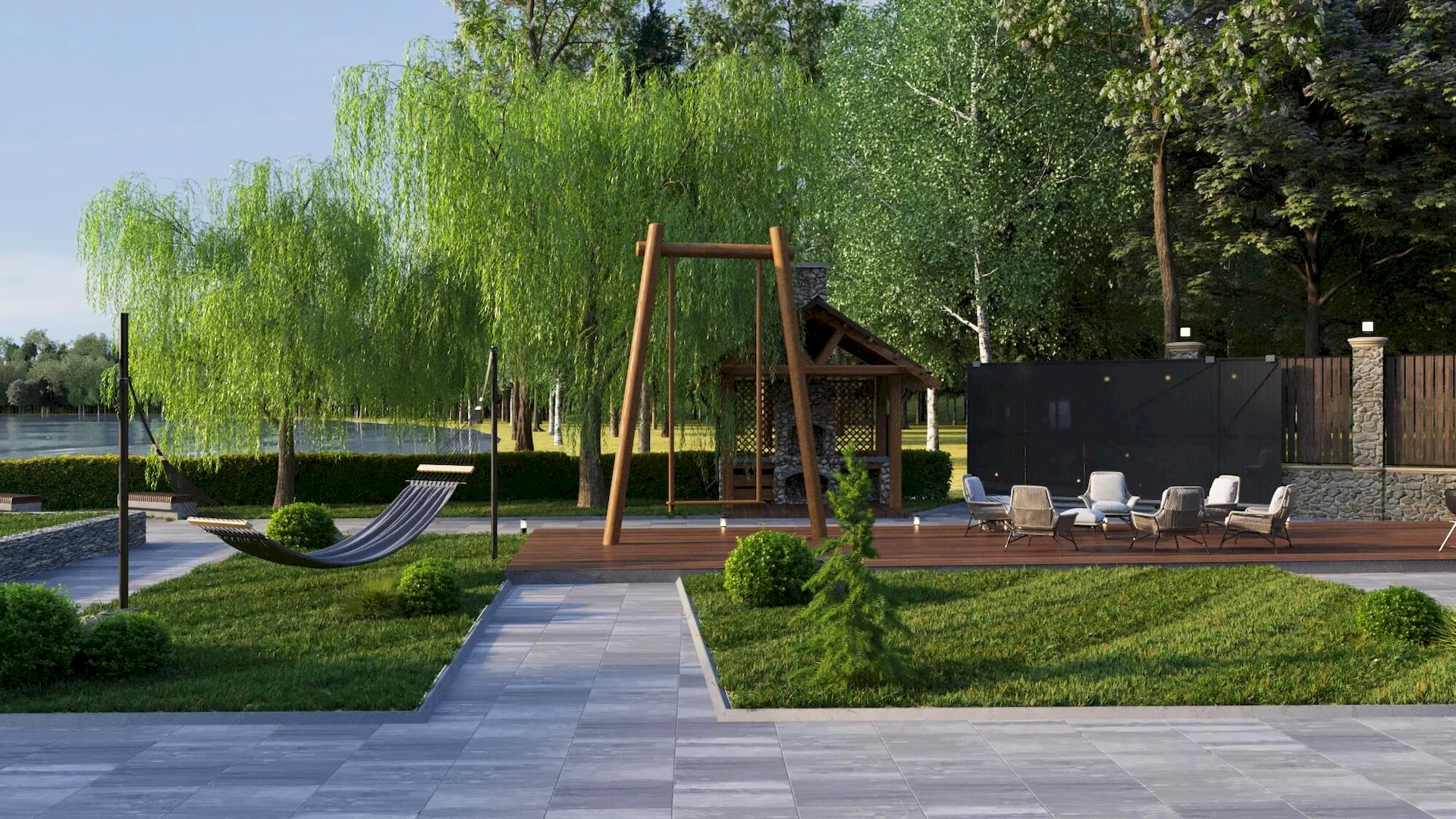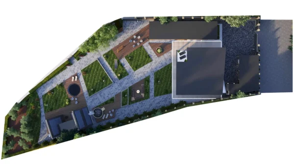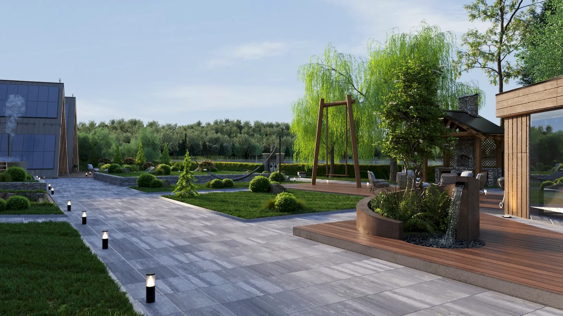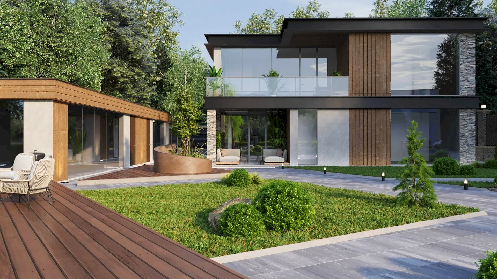 Разработка ландшафтного дизайна с большим количеством озеленения территории, большой современный дом с просторными балконами и террасой. Размещение 2 гостевых домиков и зимней террасой на большую компанию