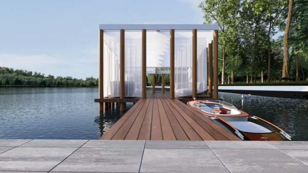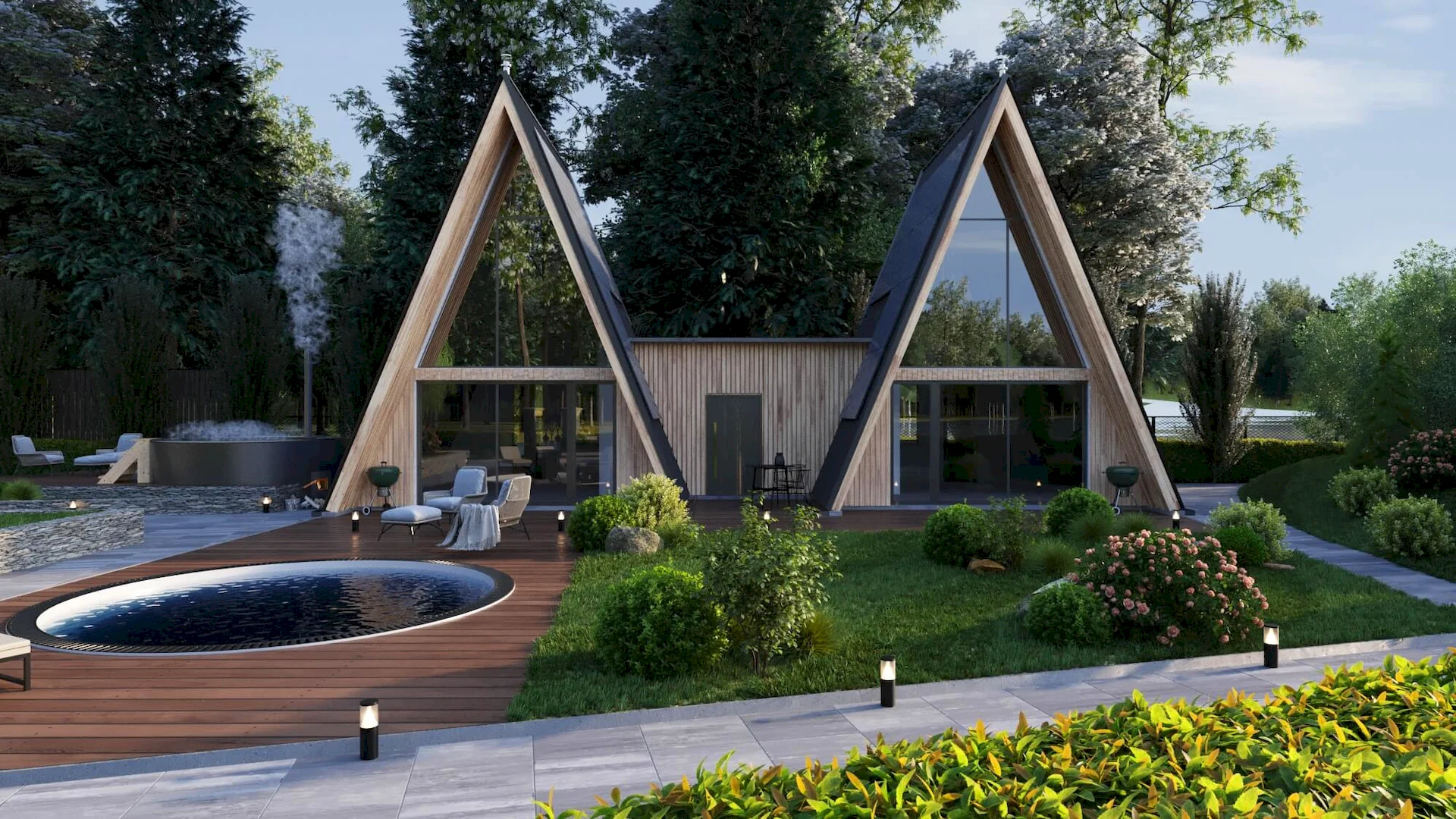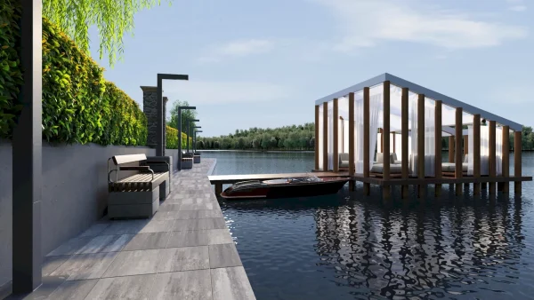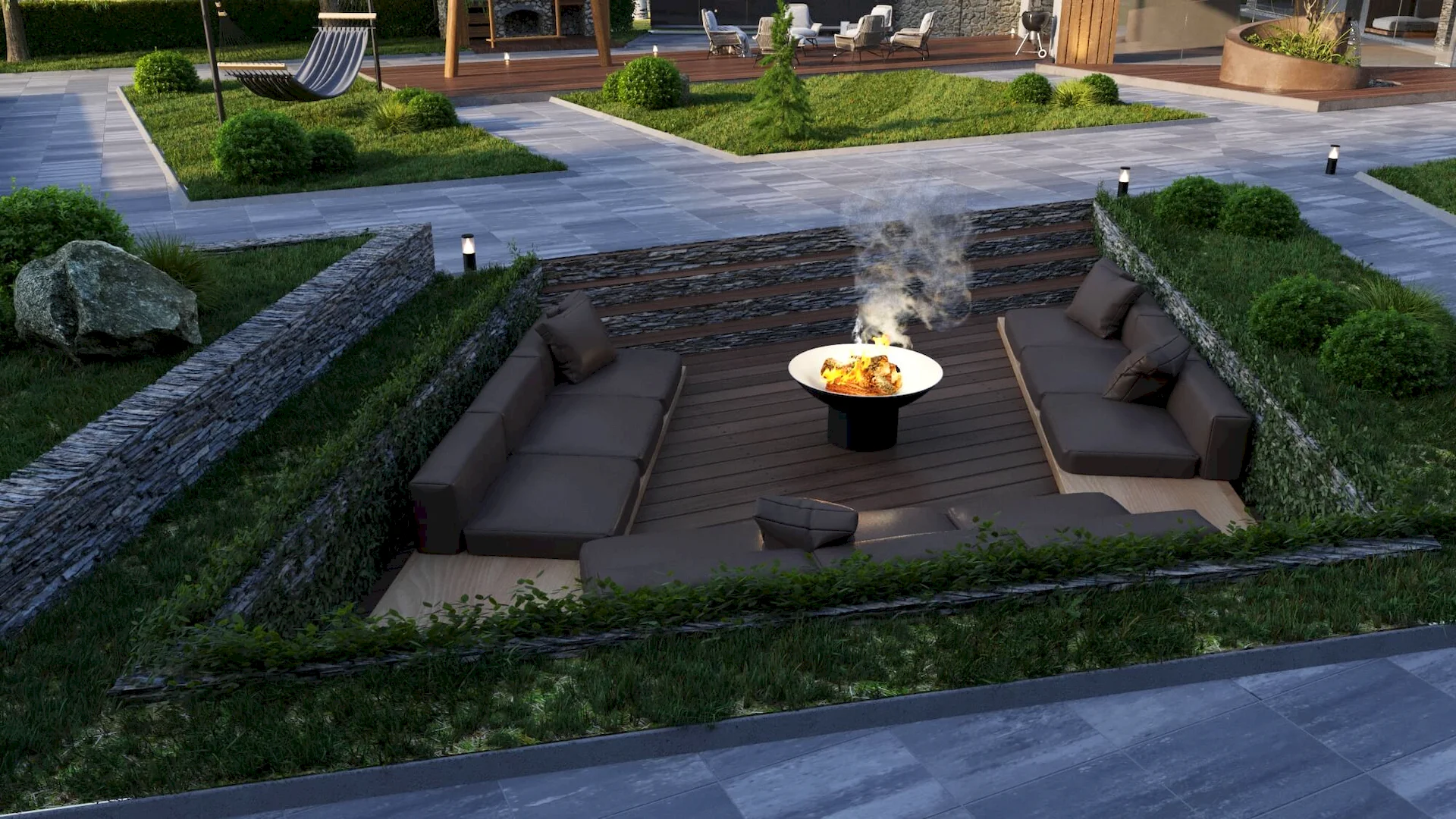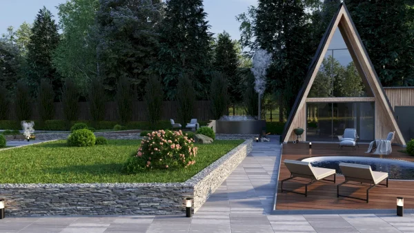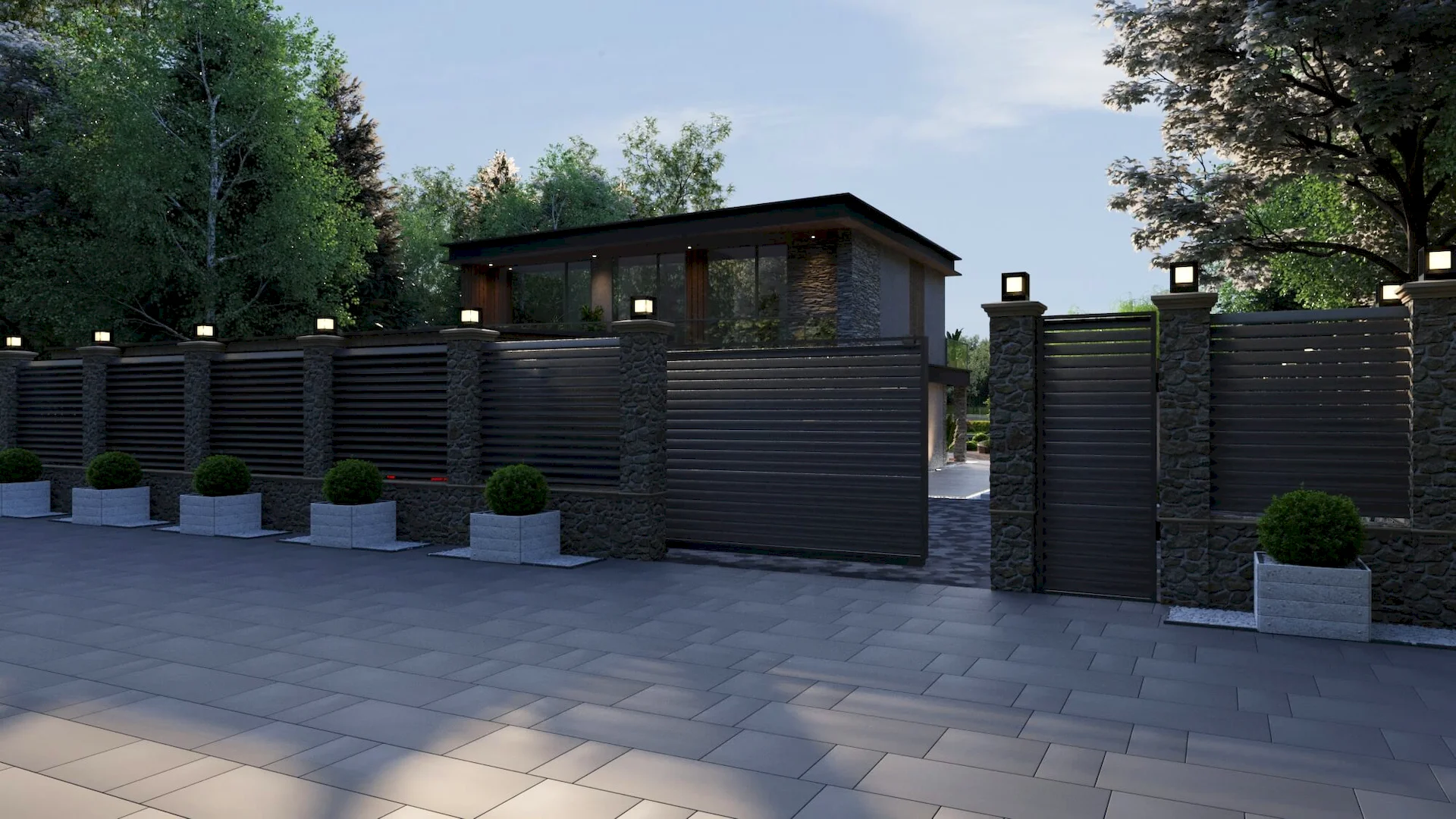 Разработка ландшафтного дизайна с большим количеством озеленения территории, большой современный дом с просторными балконами и террасой. Размещение 2 гостевых домиков и зимней террасой на большую компанию