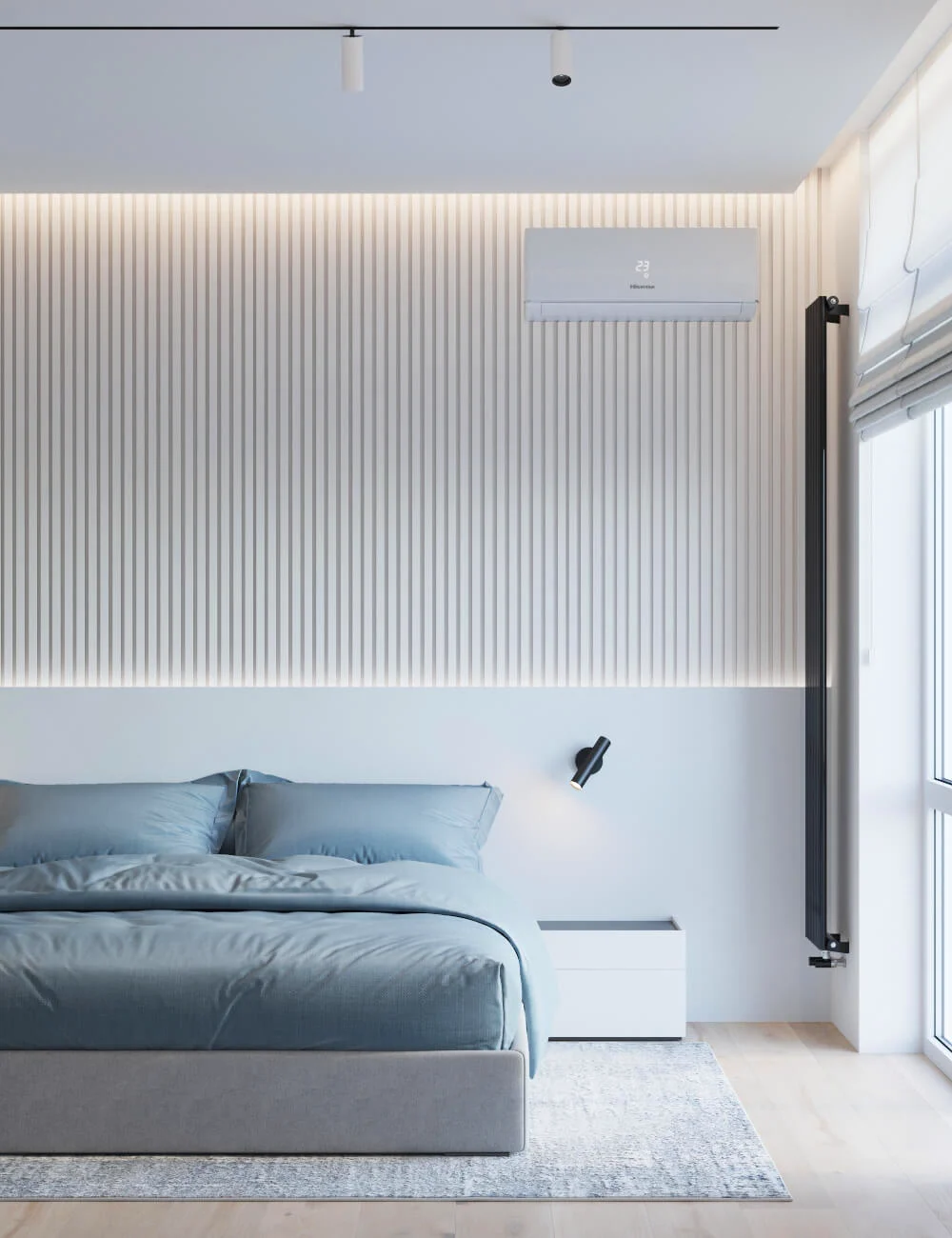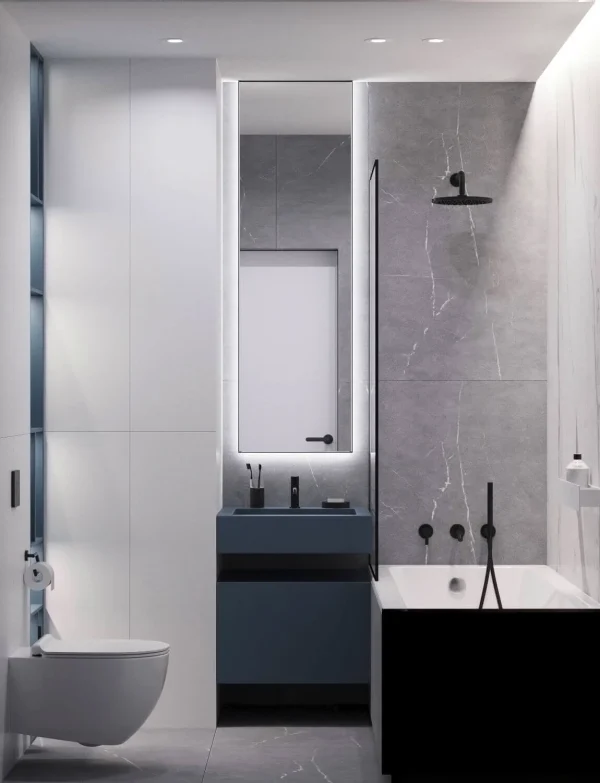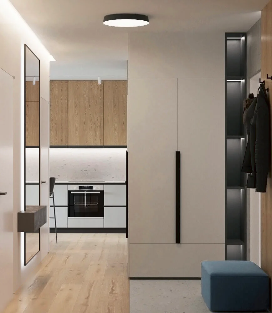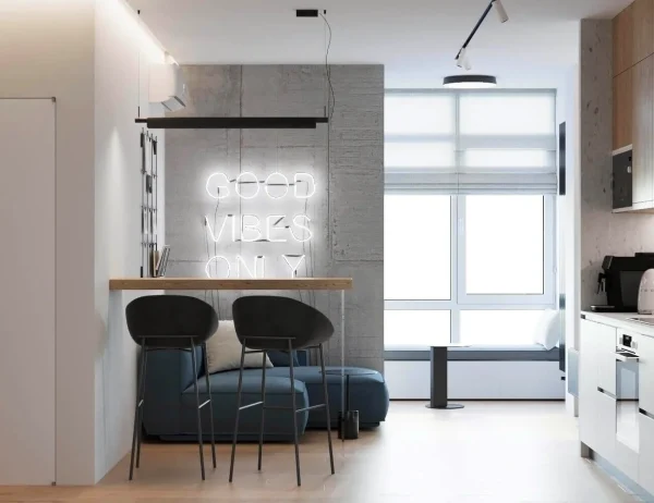 Акцентами стали – дерево светлого оттенка и синий цвет, именно они придали цвету и натуральности пространства.
