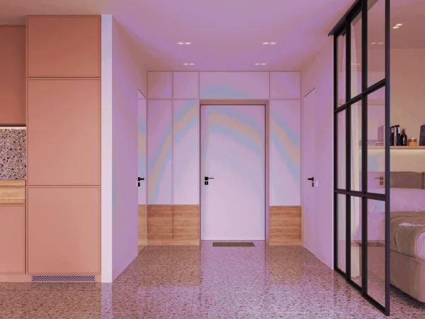 Яркий акцент проекта – цветовая палитра и пастельные элементы в кухне.