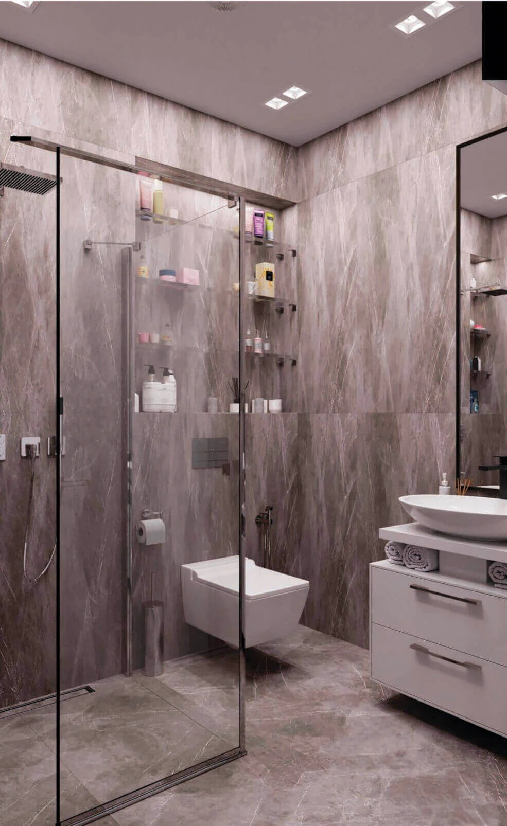 В ванной комнате использована керамогранитная плитка с каменной текстурой, подобная плитка использована на фартуке кухни. И самое любимое место заказчика – остров с барной стойкой, именно там можно и готовить ужин, завтракать, ужинать и проводить время с родными за одним столом.
